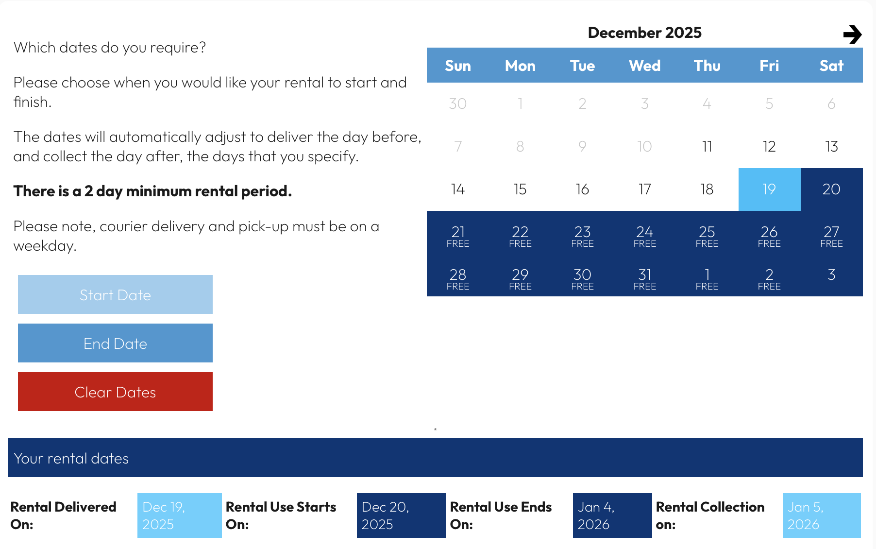 You can also book dates that extend before or after the free window. For example, start earlier in December or return later in January — you’ll still benefit from the free Christmas period in between.