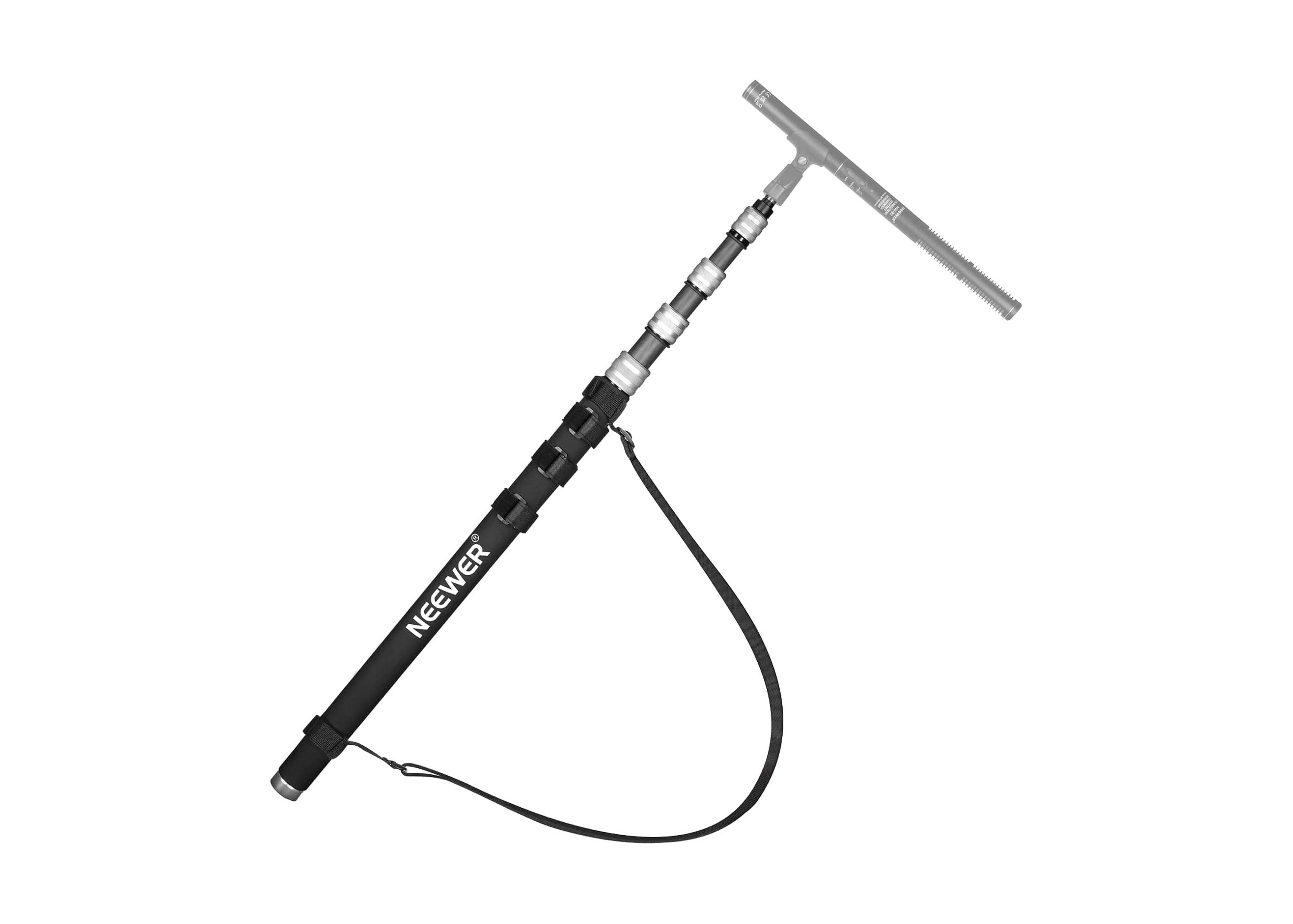 This telescopic boom mic pole extends from 2.4ft to 9.8ft. It has 1/4", 3/8", and 5/8" screw adapters.